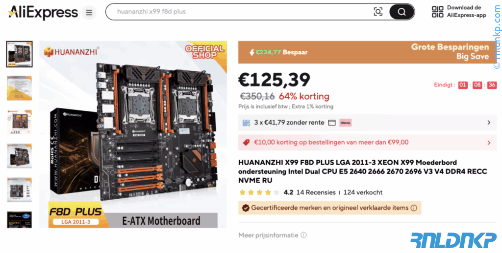 Na het lezen van diverse reviews over de X99 moederborden, fabrikanten, stabiliteit van componenten, drivers, bios en support ben ik uitgekomen bij Huananzhu die met hun X99 F8D Plus moederboard ook nog eens alle boxen aantikken! Het Huananzhi X99-F8D PLUS moederbord is op dit moment verkrijgbaar voor ongeveer 115 euro incl. gratis verzending (vergeet niet hiervoor de eventuele kortingscoupons aan te klikken – zie rode banner onder de prijs). Het bedrag is ook laag genoeg om hier geen aanvullende invoerrechten over te hoeven betalen.